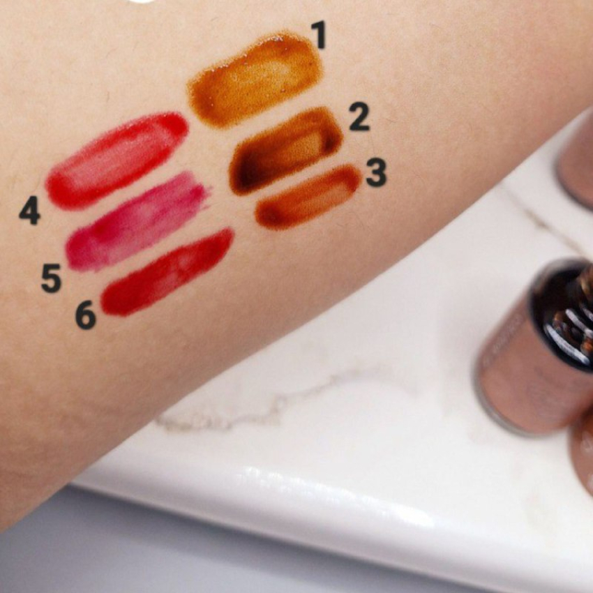 تینت قهوه ای دارای 6 رنگ (سه تناژ قهوه ای) و (قرمز.صورتی) بافت نرم و سبک قابل استفاده برای لب و گونه نرم و مرطوب کننده لب ماندگاری طولانی مدت عدم چسبندگی